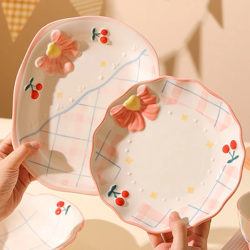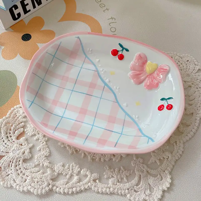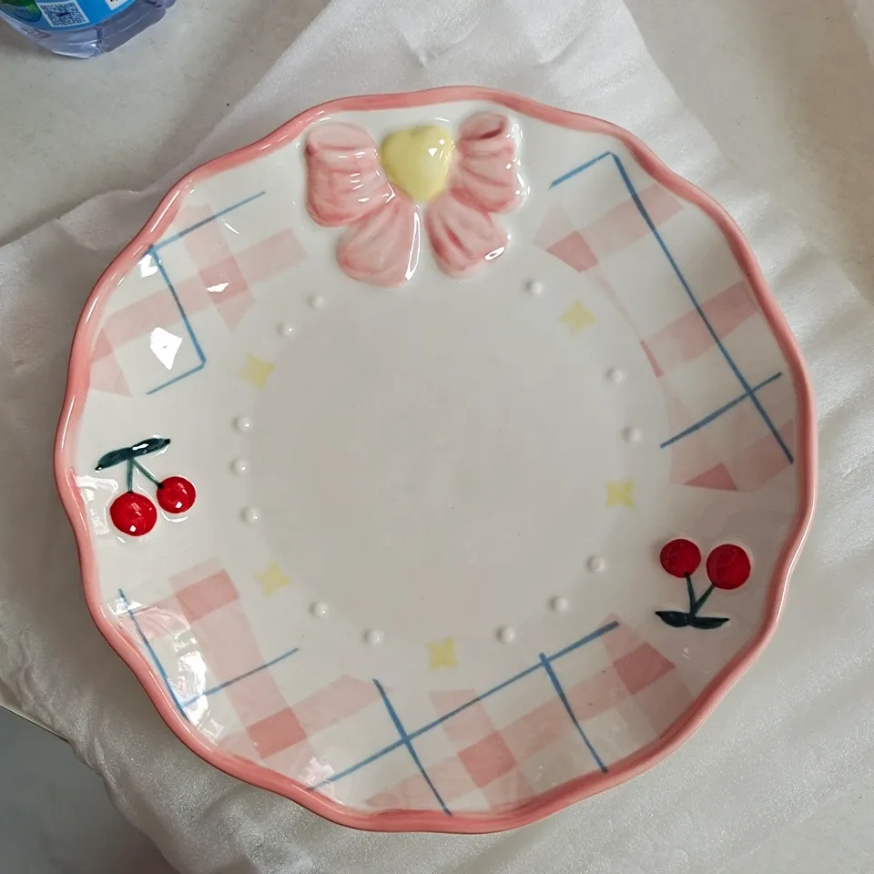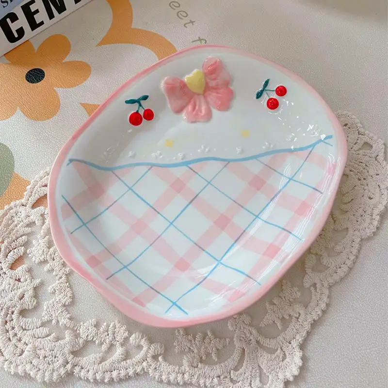 Pink Cherry & Bow Plaid Ceramic Plate Key Features: